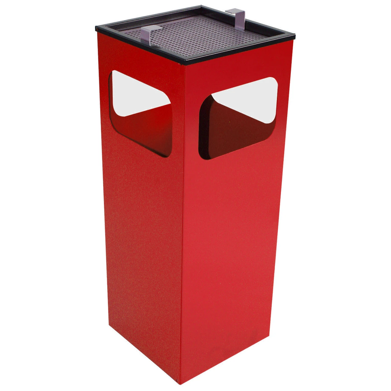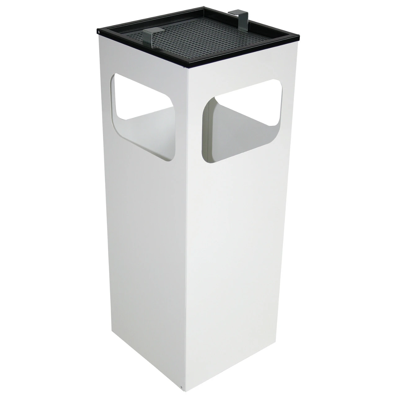 Der Kuba Ascher-Abfallbehälter ist eine einfache und praktische Kombinationslösung aus Abfallbehälter mit großzügigen 29 Liter Füllvolumen und aufgelegtem Zigarettenascher mit Sandbefüllung. Der obere Ascher kann als Sieb abgenommen und einfach gereinigt werden. Für den Wechsel der Müllbeutel dienen die Einwurfschlitze an der Seite, welche besonders großzügig sind und auch Fehlwürfe neben den Mülleimer verhindern. Durch die Stahlblechkonstruktion des Kuba ist dieser auch für Außenbereiche geeignet, sollte aber aufgrund des Sandascher überdacht eingesetzt werden.