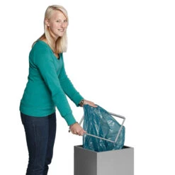 Die Abfallbehälter sind unten zusätzlich mit einem Kantenschutz versehen, welcher das Zerkratzen des Bodens beim Verschieben des Behälters verhintert. Ein Klemmring dient zur Befestigung des Abfallbeutels