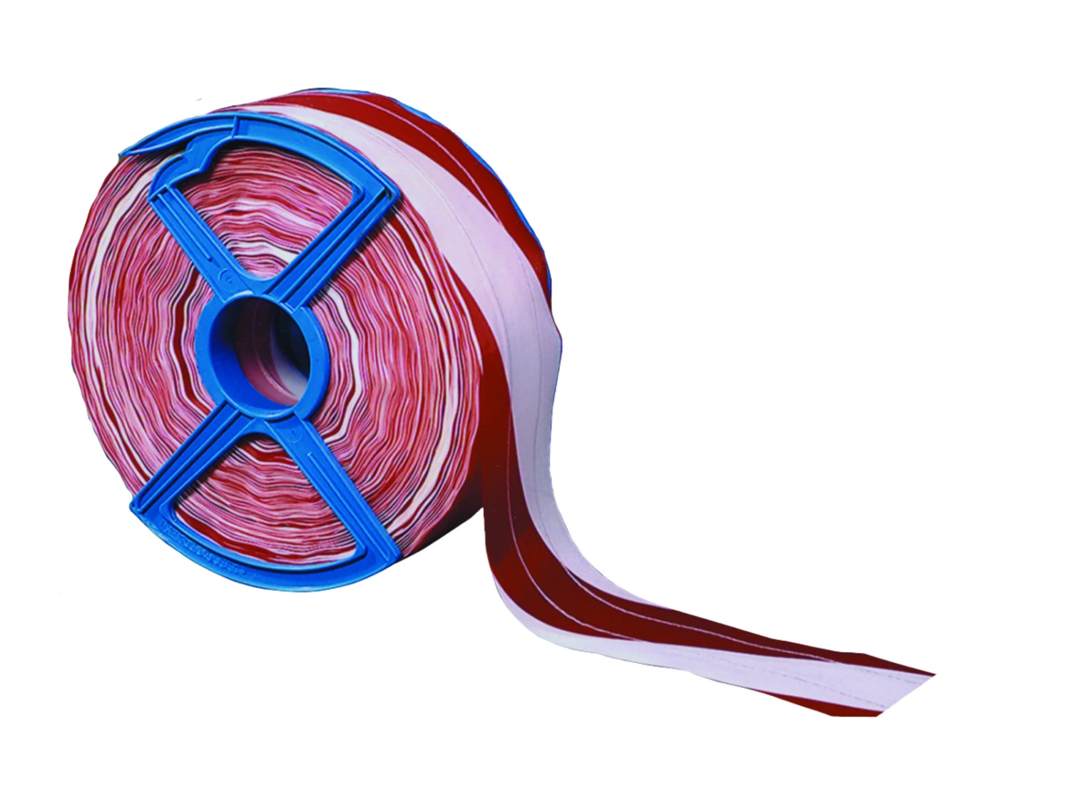 Das 250 m lange Absperrband ist auf einer Kunststoffspule gewickelt welche zusätzlich über eine geschützte Schneidvorrichtung verfügt.