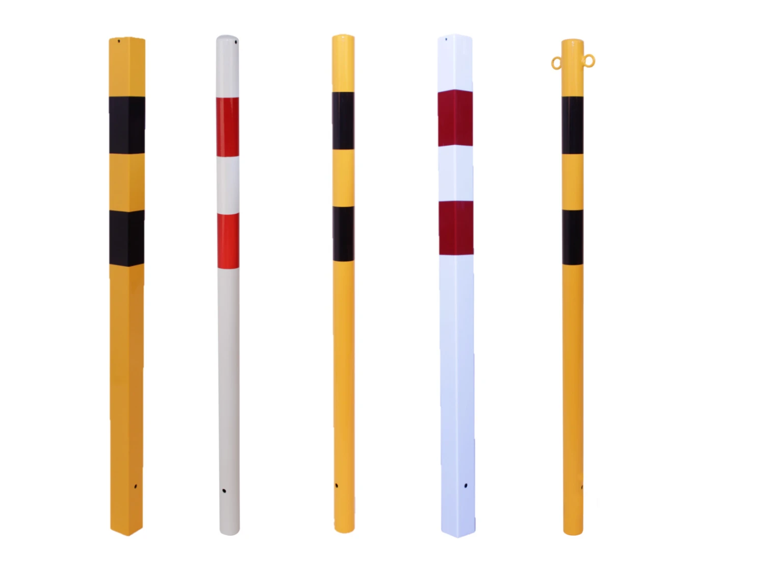 Absperrpfosten und Kettenpfosten aus verzinktem und beschichtetem Stahl sind für den Innenbereich sowie für den Außenbereich geeignet. Die Pfosten sind in runder Ausführung, Durchmesser Ø 60 mm, und als vierkant-Ausführung 70×70 mm in den Farben rot-weiß mit reflektierender Reflexfolie und gelb-schwarz erhältlich. Je nach Anwendung können die Pfosten einbetoniert werden, oder einfach in die zusätzlich erhältlichen Bodenhülse hinein gesteckt werden. Die Bodenhülsen sind für die runden sowie für die vierkant Sperrpfosten erhältlich.
