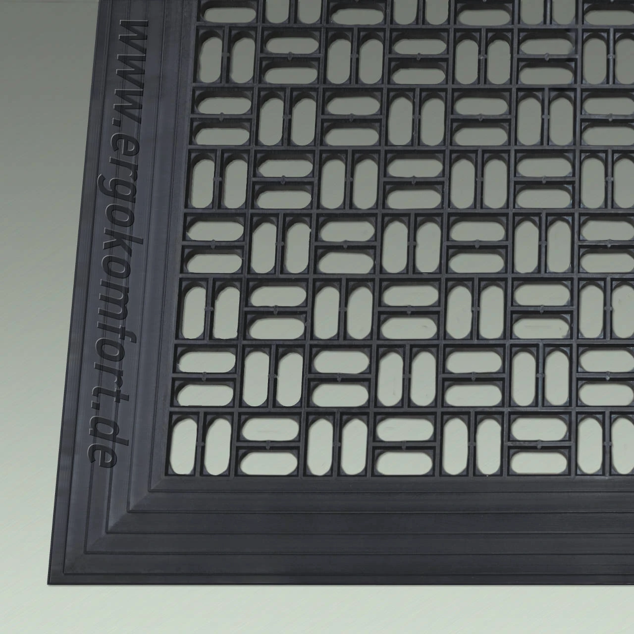 In den großen Zwischenräumen sammeln sich Flüssigkeiten, welche dann Einsatz weggewischt werden können. Der Stehkomfort wird dadurch nicht beeinträchtigt und ermöglicht die gleichen ergonomischen Vorteile bei der Arbeit wie alle gängigen Antiermüdungsmatten von ERGOKOMFORT.