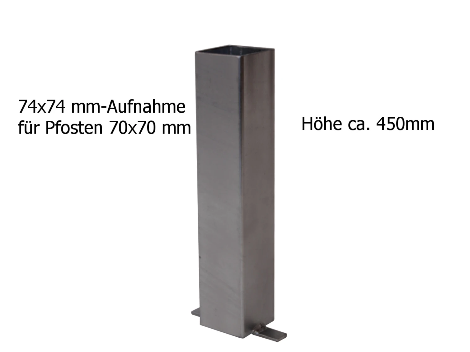 Die Vierkant-Bodenhülse mit angeschweißtem Bodenanker ist für Absperrpfosten oder Kettenpfosten 70x70mm geeignet. Die Aufnahme ist ca 74 x 74 mm groß. Der aus verzinktem Stahl gefertigte Bodenanker ermöglicht eine flexible Verwendung von Absperrpfosten oder Kettenpfosten.