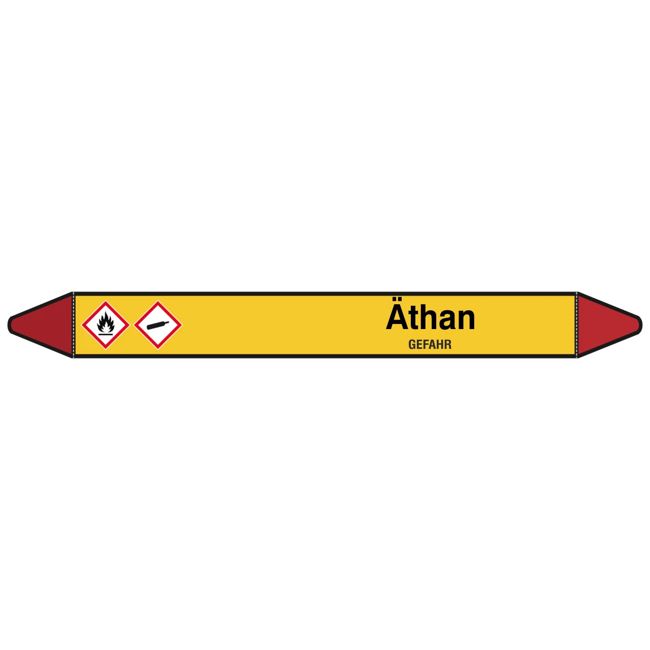 Der bereits vorgestanzte Rohrmarkierer mit dem Aufdruck Äthan – GEFAHR ist in verschiedenen Größen, je nach Rohrdurchmesser bzw. Erkennungsreichweite, erhältlich.