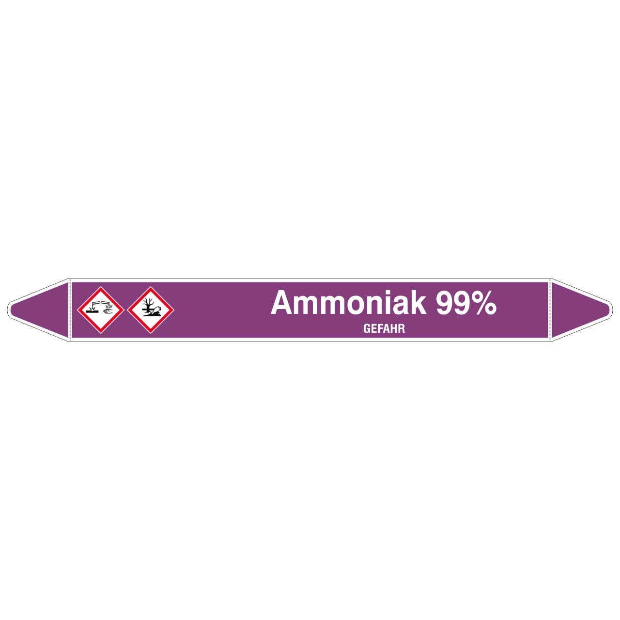 Der bereits vorgestanzte Rohrmarkierer mit dem Aufdruck Ammoniak 99 % – GEFAHR ist in verschiedenen Größen, je nach Rohrdurchmesser bzw. Erkennungsreichweite, erhältlich.