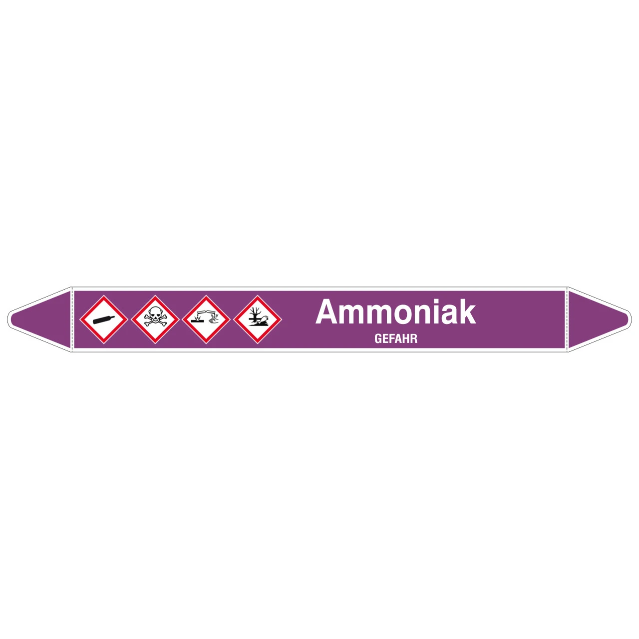 Der bereits vorgestanzte Rohrmarkierer mit dem Aufdruck Ammoniak – GEFAHR ist in verschiedenen Größen, je nach Rohrdurchmesser bzw. Erkennungsreichweite, erhältlich.