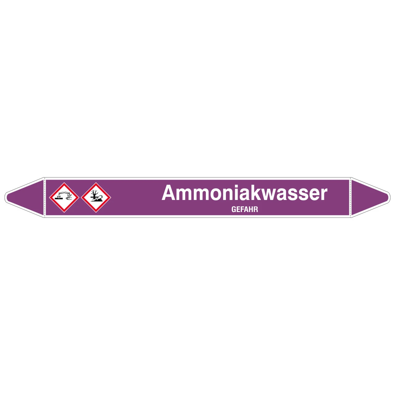 Der bereits vorgestanzte Rohrmarkierer mit dem Aufdruck Ammoniakwasser – GEFAHR ist in verschiedenen Größen, je nach Rohrdurchmesser bzw. Erkennungsreichweite, erhältlich.