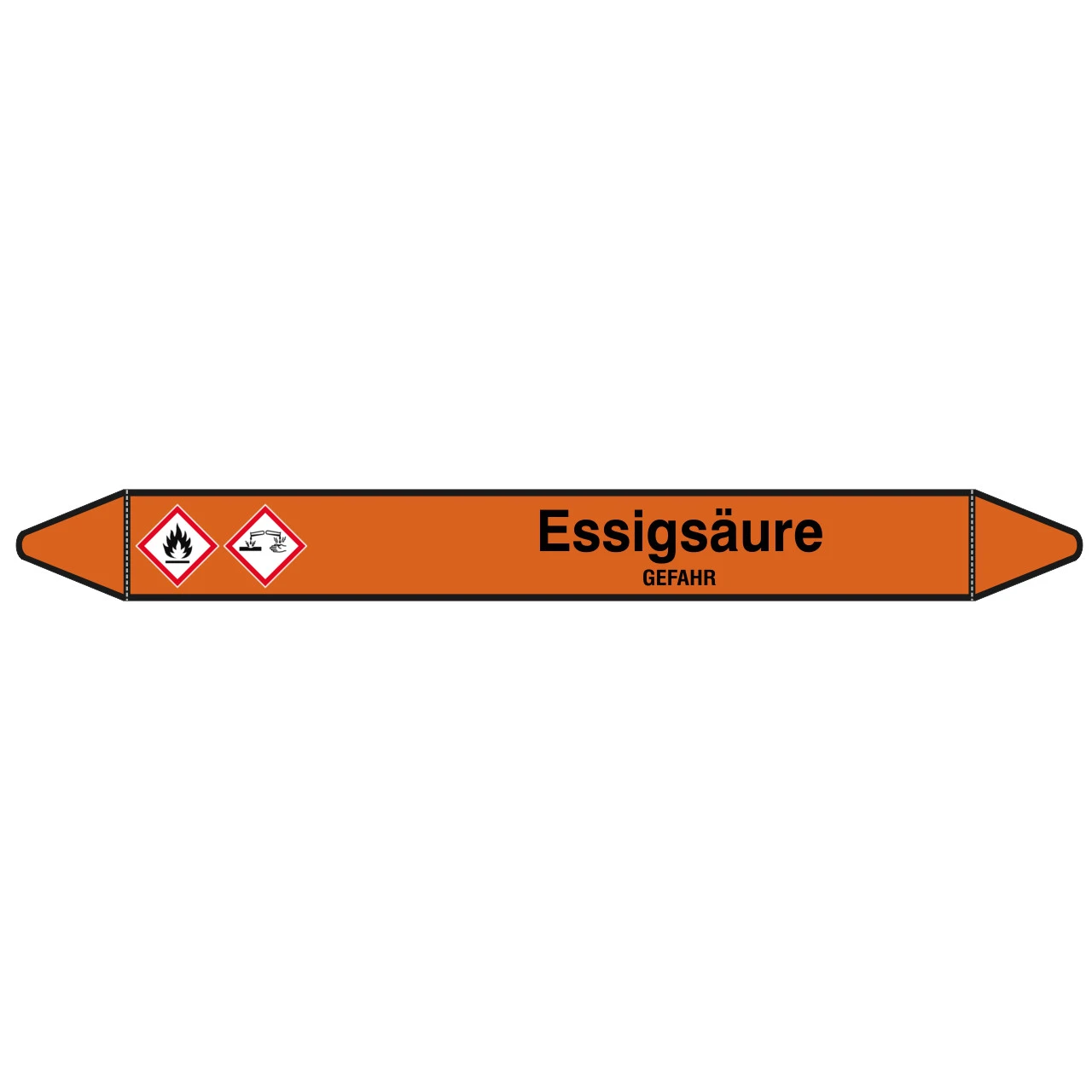 Der bereits vorgestanzte Rohrmarkierer mit dem Aufdruck Essigsäure – GEFAHR ist in verschiedenen Größen, je nach Rohrdurchmesser bzw. Erkennungsreichweite, erhältlich.