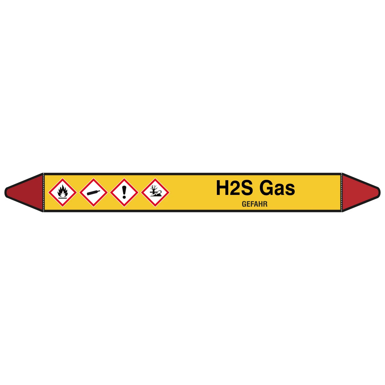Der bereits vorgestanzte Rohrmarkierer mit dem Aufdruck H2S Gas – GEFAHR ist in verschiedenen Größen, je nach Rohrdurchmesser bzw. Erkennungsreichweite, erhältlich.