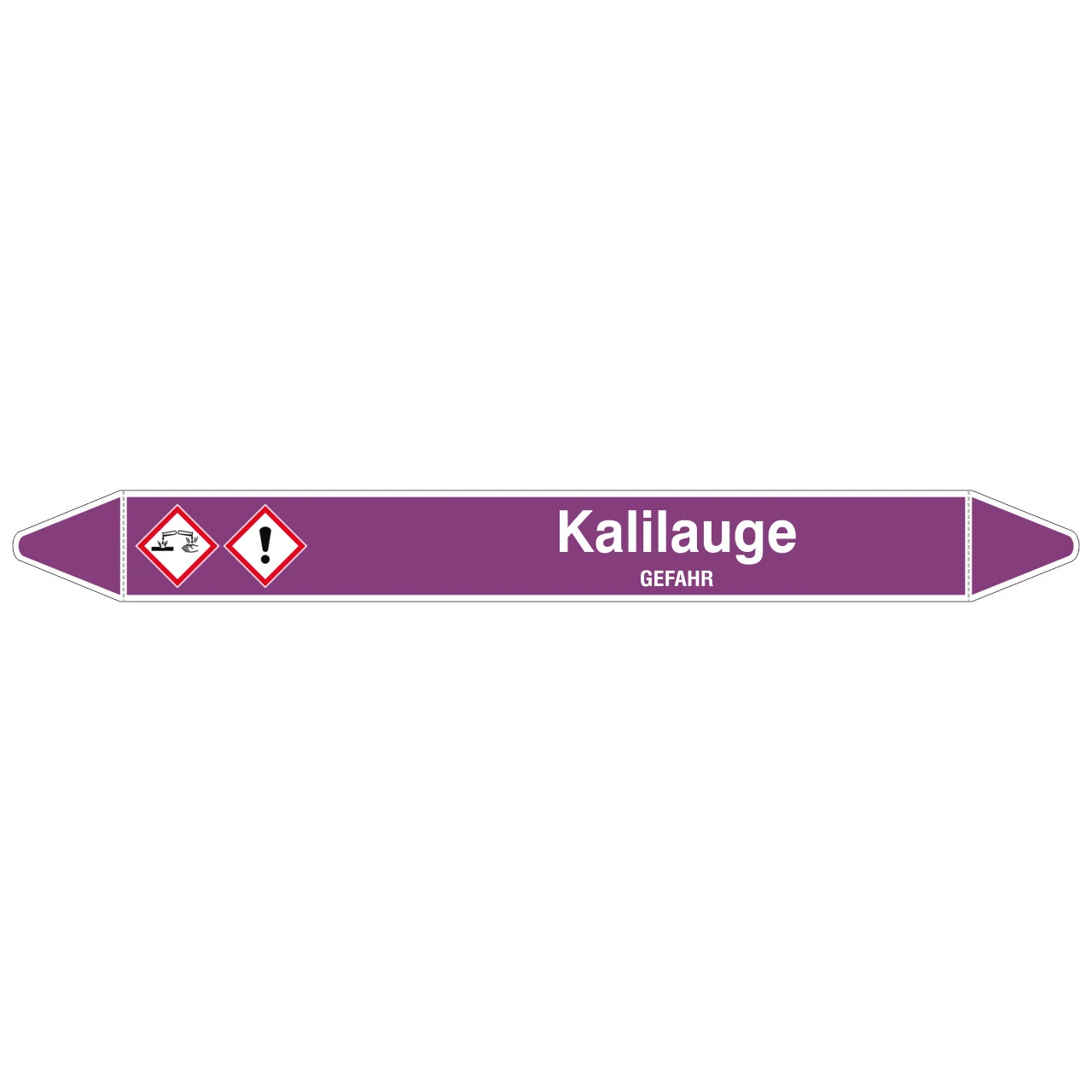 Der bereits vorgestanzte Rohrmarkierer mit dem Aufdruck Kalilauge – GEFAHR ist in verschiedenen Größen, je nach Rohrdurchmesser bzw. Erkennungsreichweite, erhältlich.