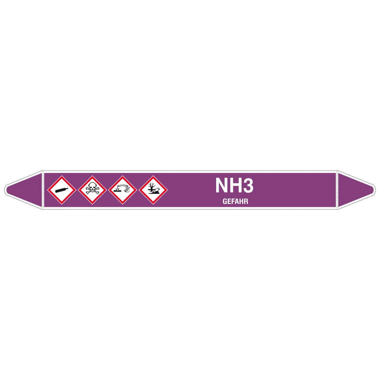 Der bereits vorgestanzte Rohrmarkierer mit dem Aufdruck NH3 – GEFAHR ist in verschiedenen Größen, je nach Rohrdurchmesser bzw. Erkennungsreichweite, erhältlich.