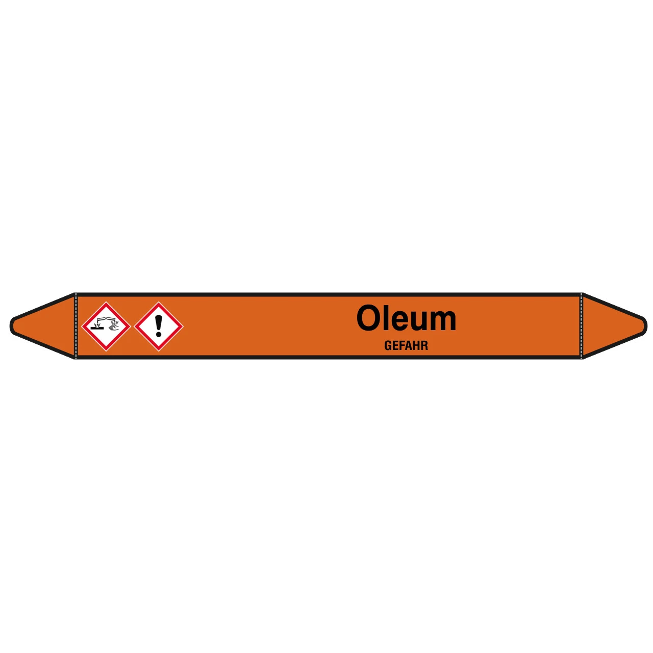 Der bereits vorgestanzte Rohrmarkierer mit dem Aufdruck Oleum – GEFAHR ist in verschiedenen Größen, je nach Rohrdurchmesser bzw. Erkennungsreichweite, erhältlich.