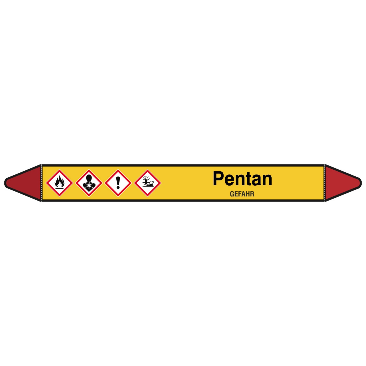 Der bereits vorgestanzte Rohrmarkierer mit dem Aufdruck Pentan – GEFAHR ist in verschiedenen Größen, je nach Rohrdurchmesser bzw. Erkennungsreichweite, erhältlich.