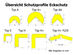 Die Eckschutz Schutzprofile Knuffi® werden zur Kennzeichnung vor potentiellen Gefahrenquellen, wie Kanten, Ecken, Vorsprünge oder Hindernissen eingesetzt um harte Stöße zu absorbieren um Verletzungen oder Sachschäden vorzubeugen. Die Knuffi® Schutzprofile zeichnen sich dabei vor allem durch Ihre hohe Flexibilität, Robustheit und Widerstandsfähigkeit aus. Die Profile können bei Temperaturen von -40°C bis +100 °C eingesetzt werden und sind feuchtigkeitsresistent. Dadurch sind die Eckschutz Schutzprofile im Innen- und Außenbereich vielseitig einsetzbar. Die Schutzprofile vom Flex Typ H+ gibt es bei uns in folgenden Ausführungen: