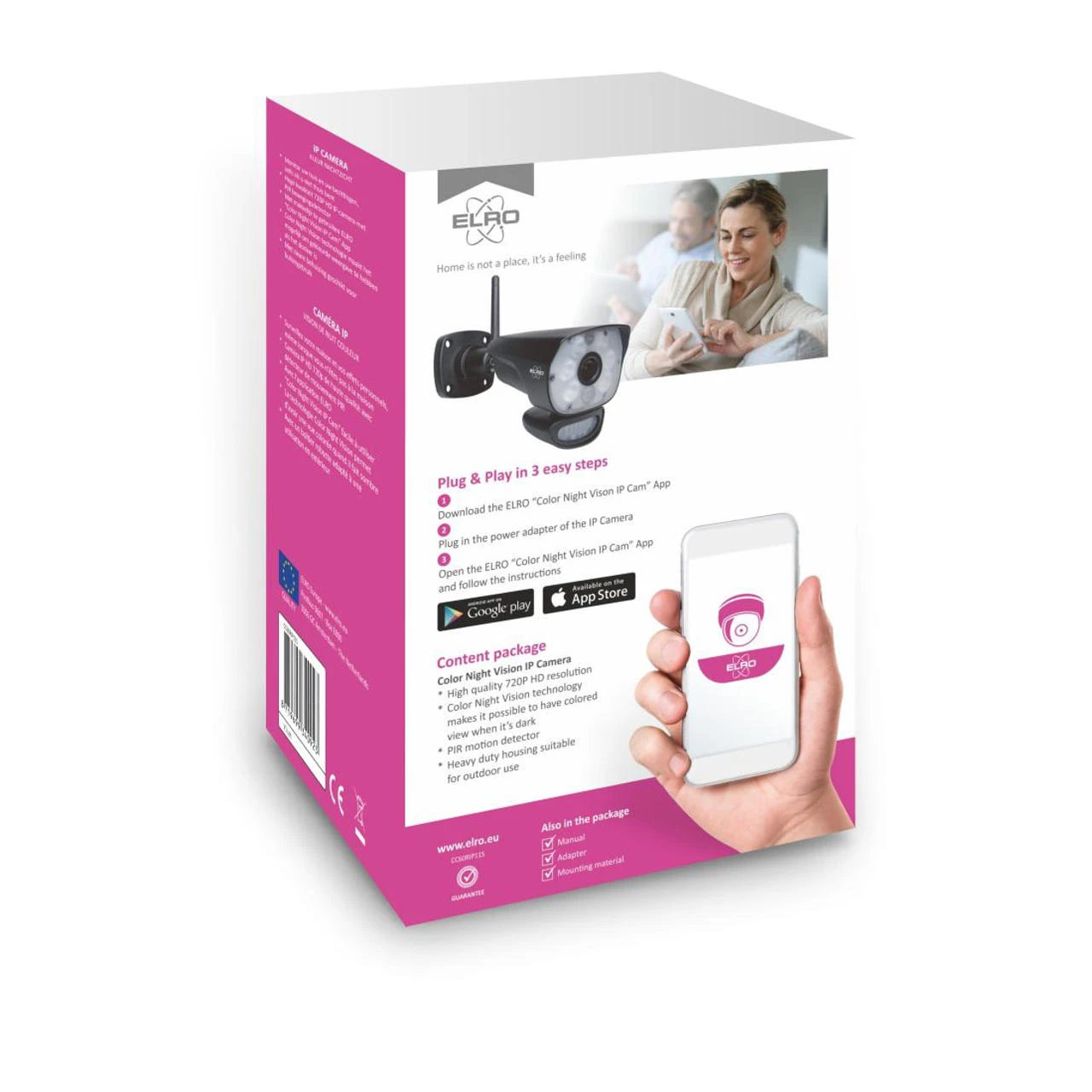 Mit neuester Technik ausgestattet liefert die Colour Night IP Kamera von Elro scharfe Bilder direkt auf Ihr Tablet oder Smartphone. Somit sind Sie auch unterwegs jederzeit bestens informiert. Der Name lässt es bereits vermuten, die Kamera verfügt über eine hohe Farbqualität mit 720p Auflösung sowie einen Nachtsichtmodus durch Infrarot LED´s.