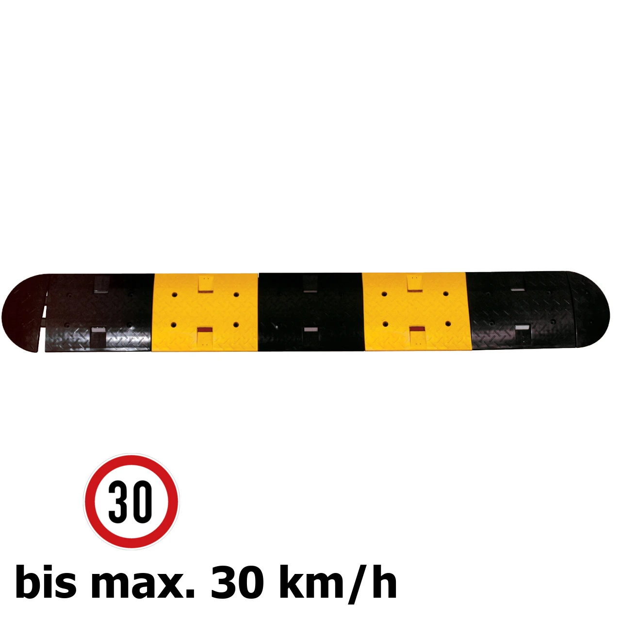 Die modulare Aufbauweise sorgt dafür, dass je nach Anforderung die Fahrbahnschwelle auf die gewünschte Länge individuell angepasst werden kann. Reflektoren auf den Mittelstücken sorgen sowohl bei Tag als auch bei Nacht für eine hohe Sichtbarkeit.