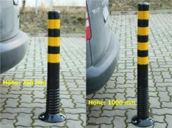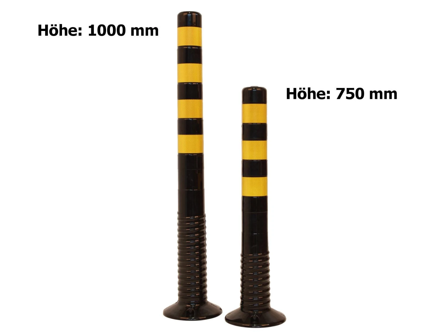 Durch die schwarz-gelbe Farbgebung sind die Absperrpfosten als solches deutlich zu erkennen. Die flexiblen Pfosten sind in den Höhen 750 mm oder 1000 mm erhältlich. Der Durchmesser beträgt 80 mm.