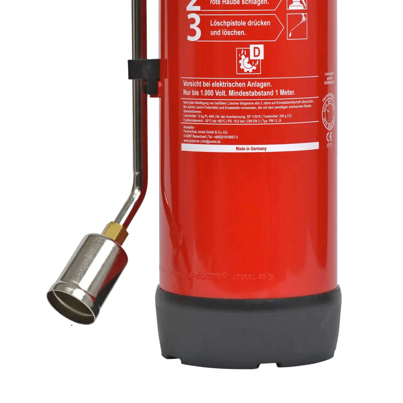 Der Metallbrandlöscher Jockel PM 12 JX ist ein Löscher, welche speziell für Metallbrände entwickelt wurde. Das spezielle Löschpulver für Metallbrände besteht größtenteils aus Salzen, welches mittels Löschlanze und speziellem Applikator mit geringem Druck auf das brennende Metall aufgetragen wird. Der geringe Druck verhindert weitestgehend ein Aufwirbeln der brennenden Späne, ein ausbreiten des Brandes wird dadurch vermieden.
