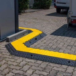 Kabel und Schläuche können problemlos von oben in die Kabelbrücke eingelegt werden. Die Seiten der Kabelbrücke sind abgeschrägt, was ein leichteres Überfahren ermöglicht. Die max. Achslast beträgt bei den 2-Kanalkabelbrücken 4 t, bei den 3- und 5-Kanalkabelbrücken jeweils 8 t.