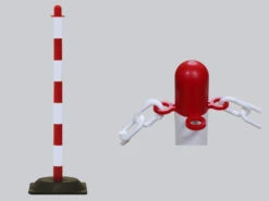 Das Kettenpfostenset besteht aus 6 rot-weißen Kunststoffpfosten Ø 40mm, 6 Fußplatten und einer 10 m langen Kunststoffkette in rot-weiß.
