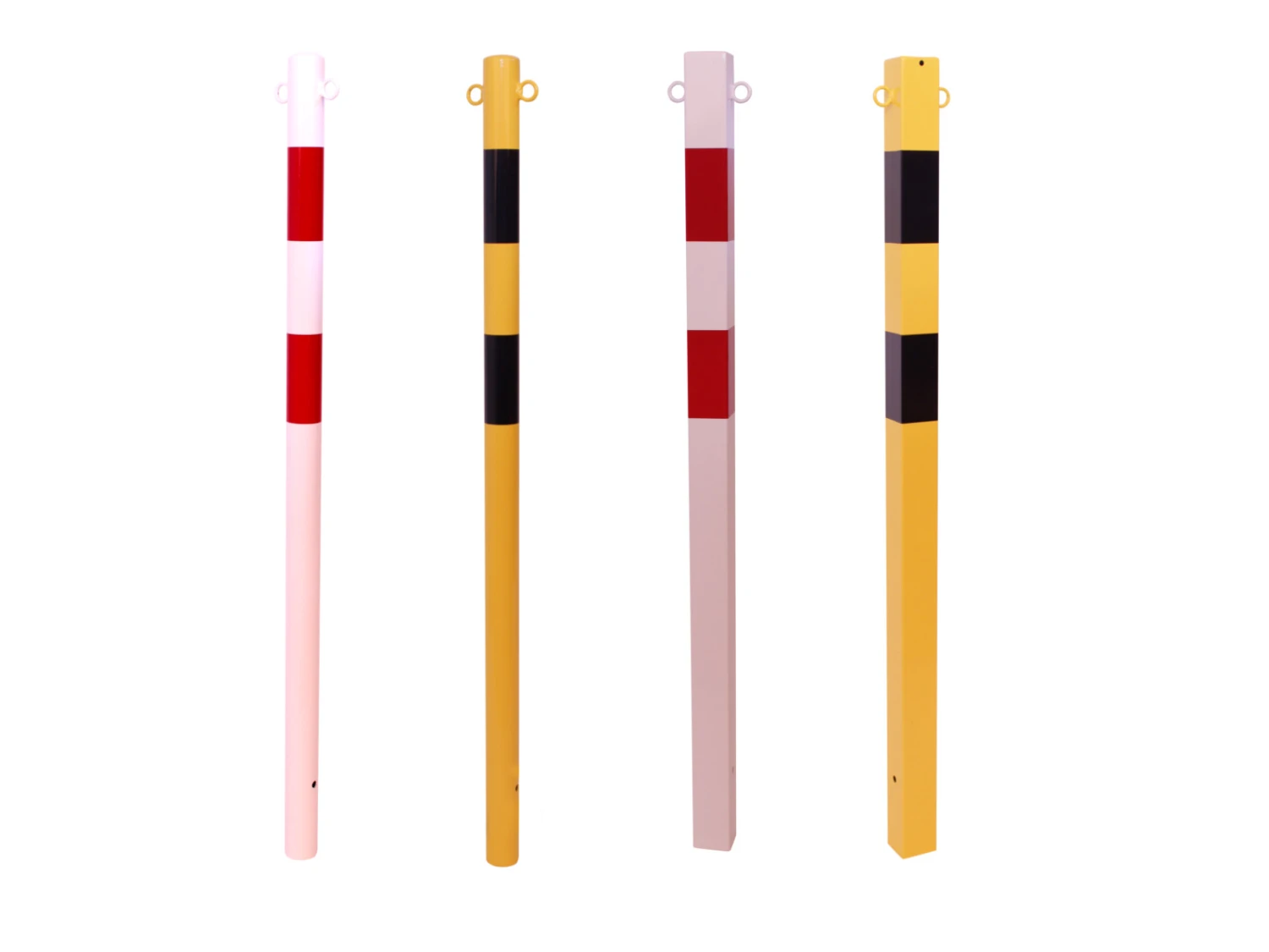 Die aus verzinktem und beschichtetem Stahl gefertigten Kettenpfosten sind für den Innenbereich sowie für den Außenbereich geeignet. Die Kettenpfosten sind in unterschiedlichen Ausführungen, Durchmesser Ø 60 mm und 70×70 mm, in den Farben rot-weiß mit reflektierender Reflexfolie und gelb-schwarz erhältlich.