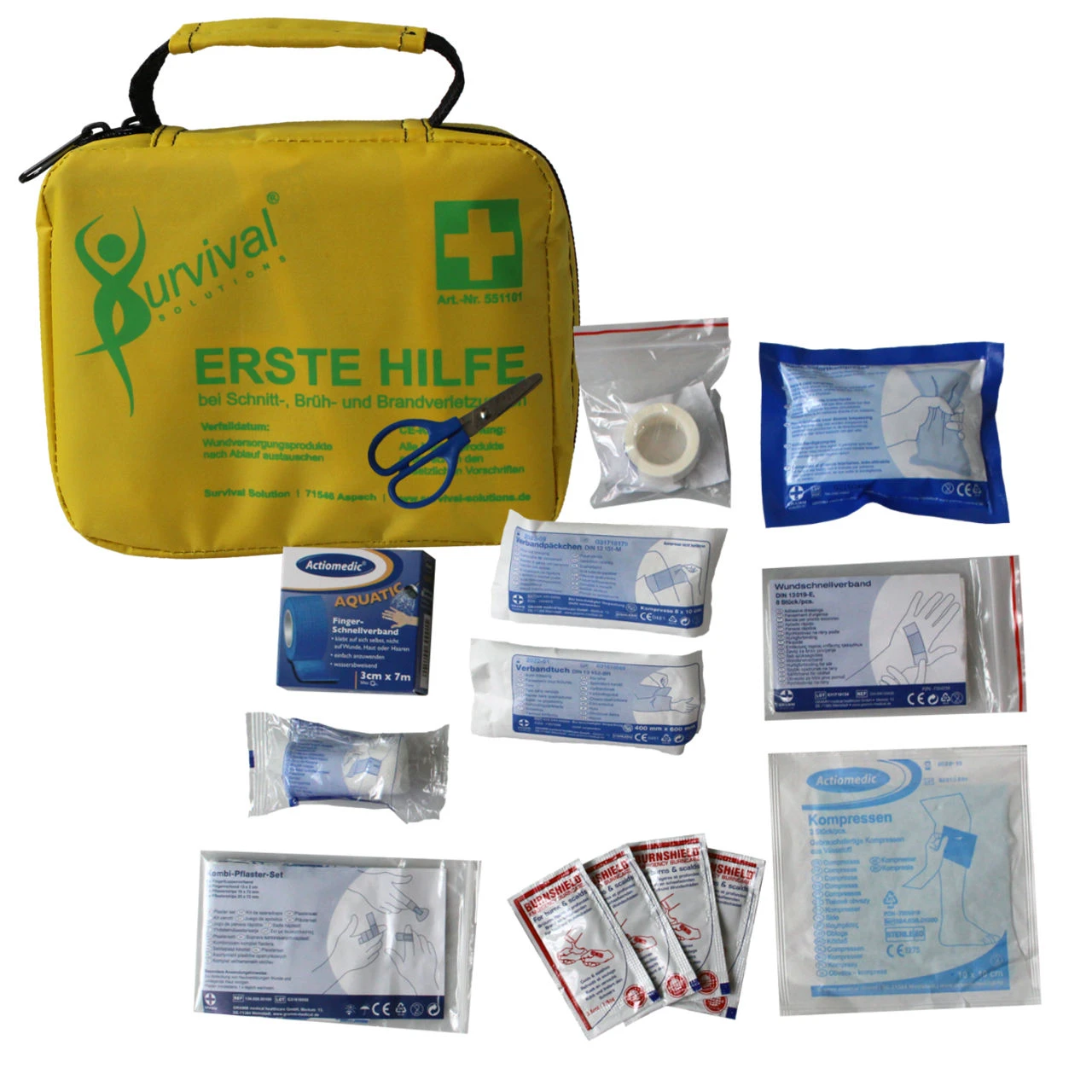 Ein kompaktes Set für zu Hause oder unterwegs. Enthalten sind unter anderem Pflaster, Mullbinden, sowie Cool-Packs und kühlende Salben bei Verbrennungen.