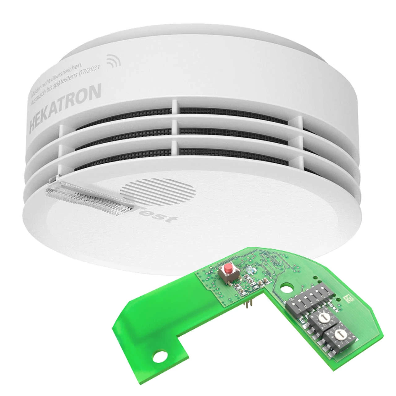 Set-Artikel bestehend aus Rauchwarnmelder Hekatron Genius PLUS X und dem Funkmodul Pro X.