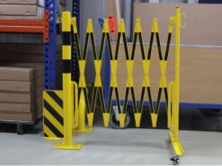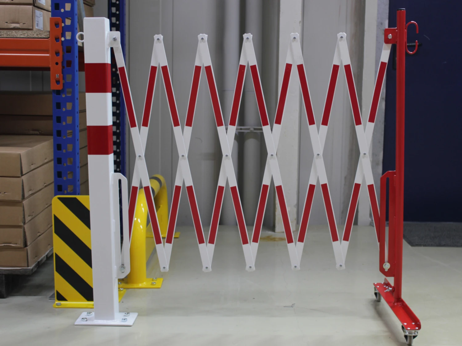 Als Farbauswahl stehen rot-weiße Scherengitter mit beidseitig rot reflektierender Warnmarkierung oder Gitter in der Farbkombination gelb-schwarz zur Auswahl. Für ein einfaches Öffnen und Schließen des Gitters sorgt der Rollenfuß mit 2 Rollen, wobei eine Rolle feststellbar ist.