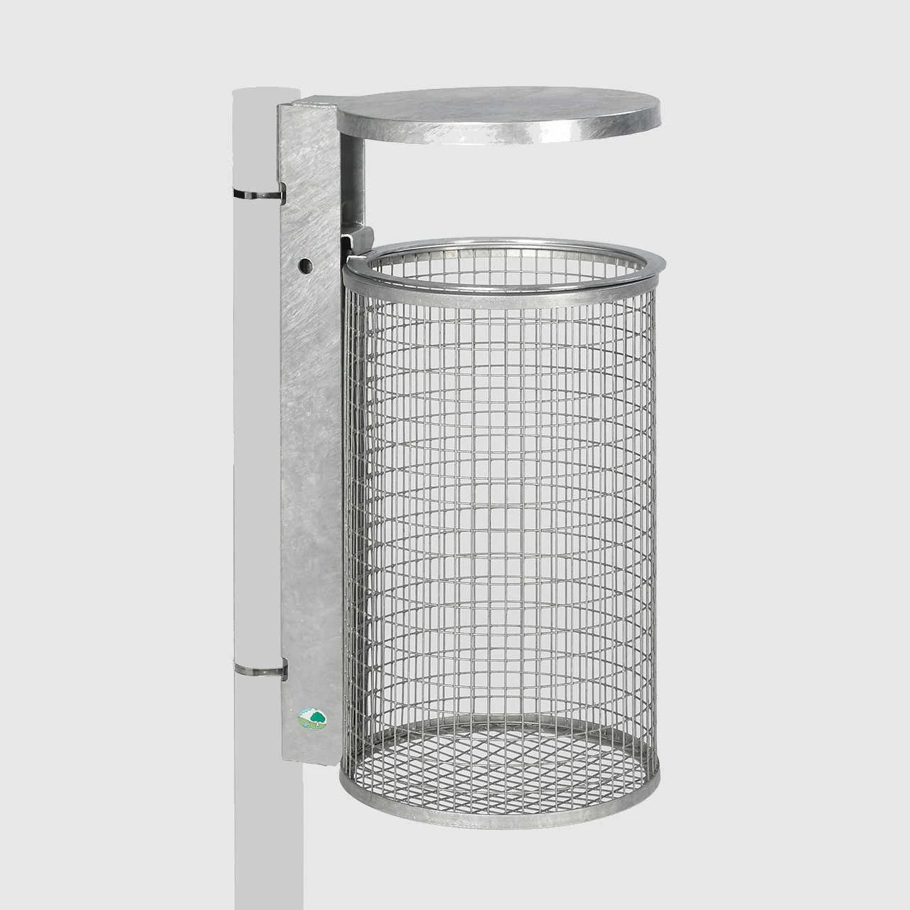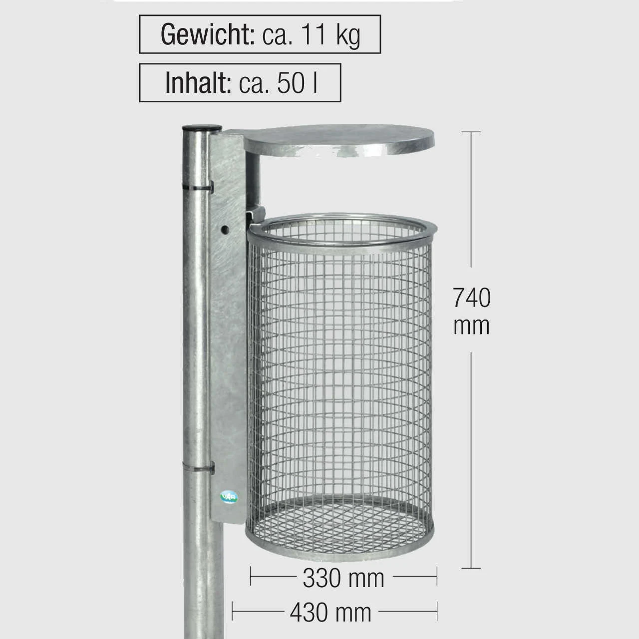 Der AbfallbehĂ€lter WR 2 bestehend aus einem Drahtkorb, Halter und Schutzdach ist aus Stahlteilen gefertigt und komplett feuerverzinkt. Der abnehmbare Drahtkorb verfĂŒgt zudem einem Klemmring fĂŒr die Befestigung von KunststoffsĂ€cken, BehĂ€ltervolumen ca. 50 Liter.