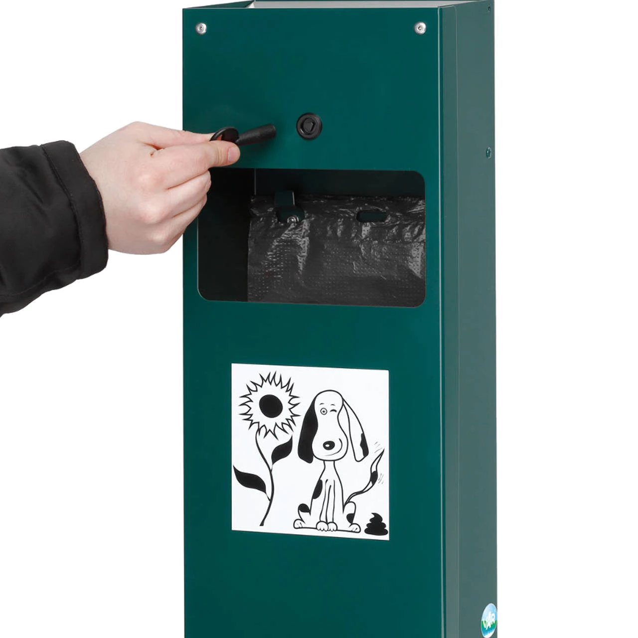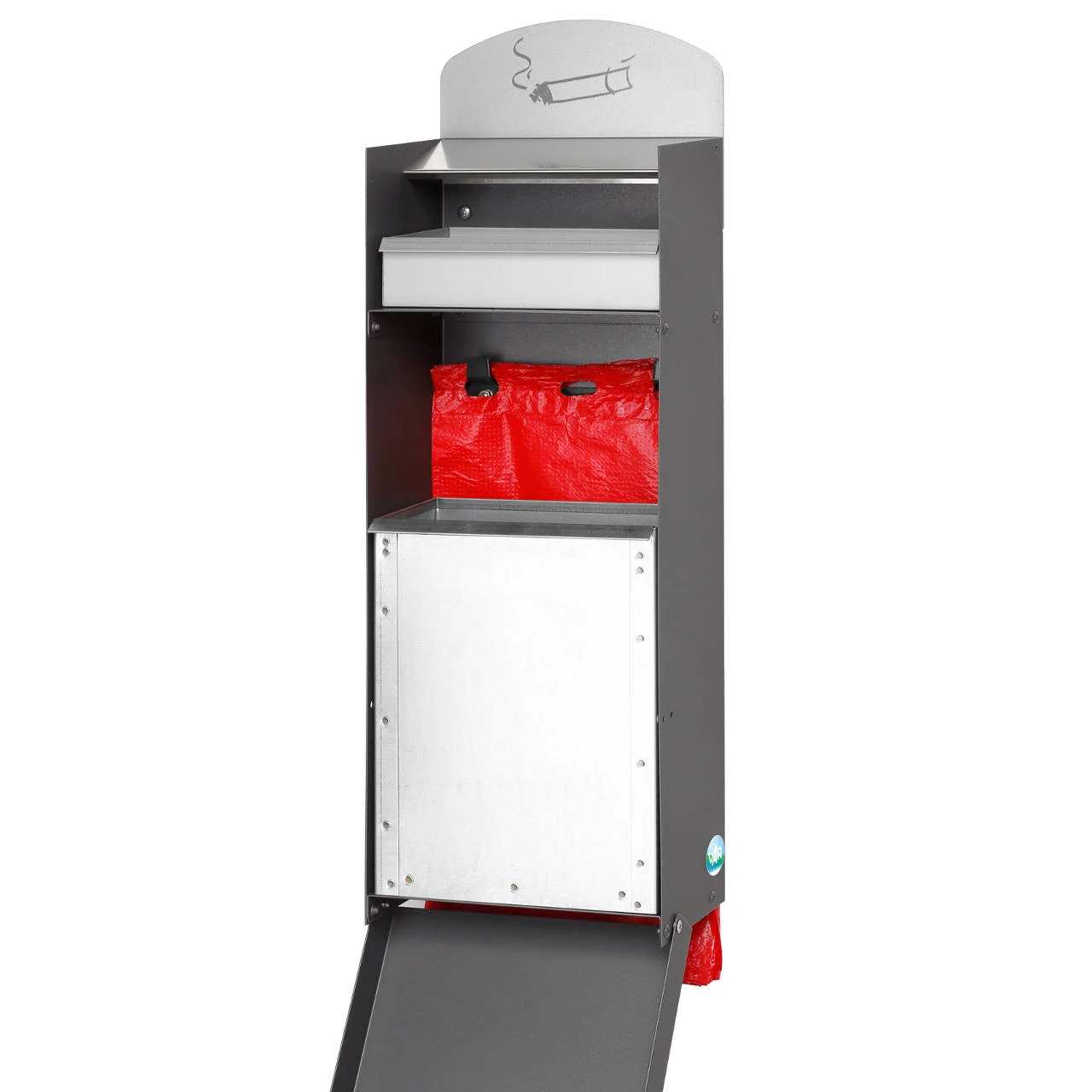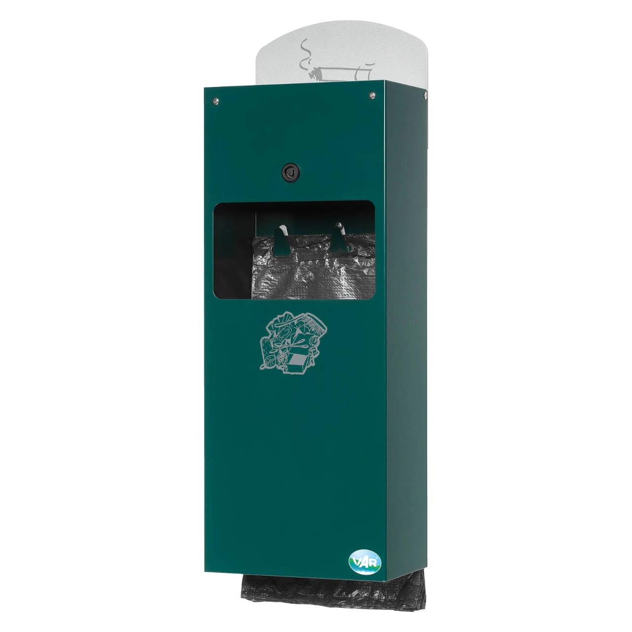 Der Hundekotbeutelspender DS 4 von VAR ist neben dem Inneneinsatz für Abfälle zusätzlich mit einem Ascher ausgestattet und aus verzinktem, pulverbeschichtetem Stahlblech gefertigt. Der entnehmbare Aschereinsatz hat eine Größe von ca. 0,4 Liter, der Abfallbehältereinsatz hat ein Volumen von ca. 4,0 Liter.