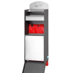 Die vordere Abdeckung ist mit einem Dreikantschloss gesichert und kann zum Entleeren der Inneneinsätze bzw. zum Befüllen / Nachfüllen der Hundekotbeutel nach unten geklappt werden.