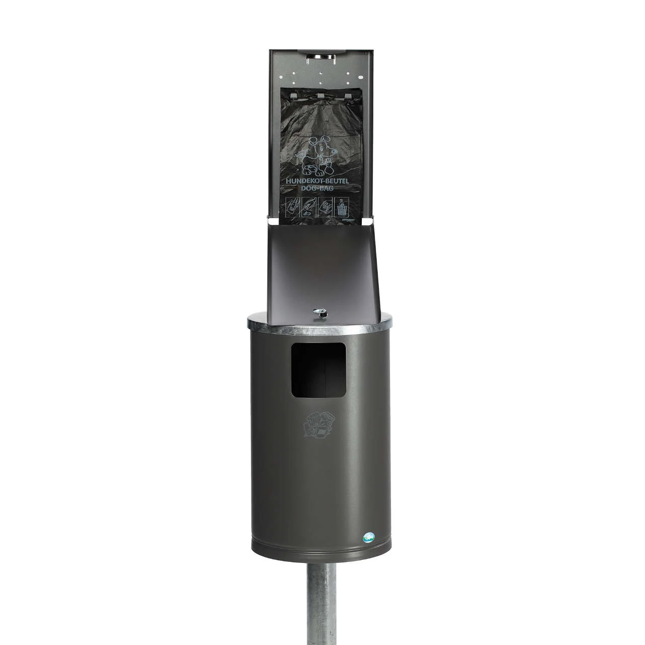 Die Hundetoilette besteht aus dem Hundekotbeutelspender DS 2, dem Abfallbehälter WR 1 sowie einem mehrteiligen verzinktem Standrohr zum Einbetonieren.