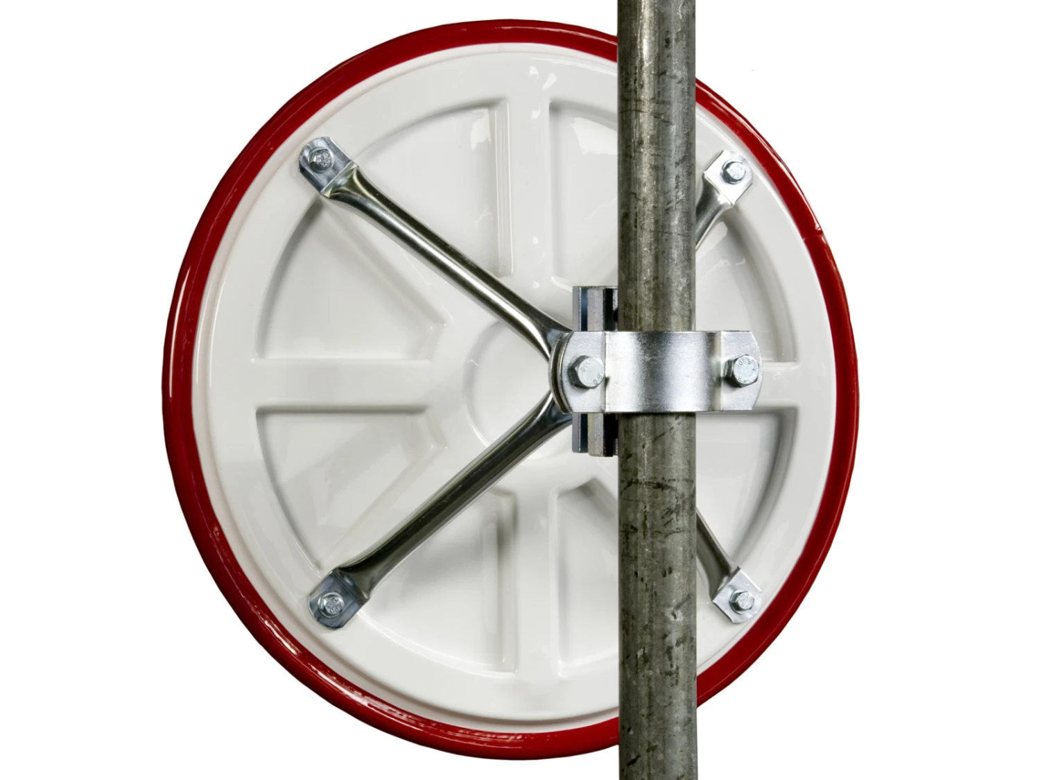Der Spiegel wird mittels mitgelieferter 4-Punkt-Kugelgelenk-Haterung an die Wand oder auch an Rohrpfosten mit einem Durchmesser von Ø 50 – 85 mm befestigt.